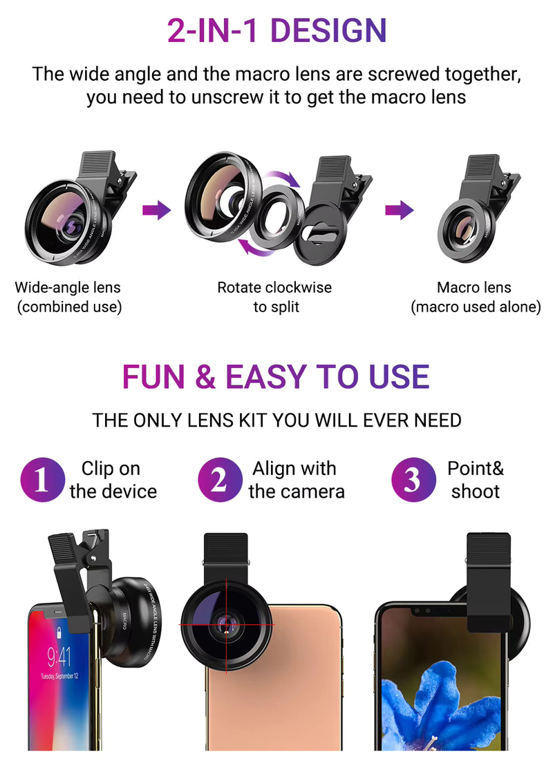 - 🔄 2-in-1 wide-angle & macro lens